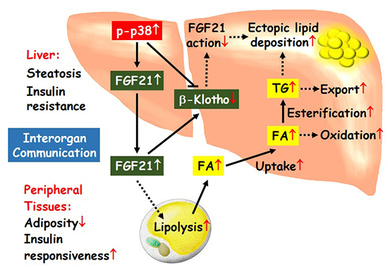NAFLD是肥胖的常见并发症,已成为当前全球重要的公共健康问题之一。虽然多种模型表明遗传、生理和环境因素参与调控肝脏脂质代谢和肝脏脂肪变性的发生发展,但肝脏脂质堆积的机制仍然需要更深入的研究。既往研究表明,无论是在饥饿还是在遗传或饮食诱导的脂肪肝小鼠模型中,肝脏中p38的磷酸化水平显著上升,然而p38的激活是肝脏脂质堆积的原因还是结果尚不清楚。FGF21是新型的内分泌激素,主要由肝脏分泌,对机体多个组织有重要的代谢调控作用。FGF21类似物对多种代谢性疾病都有潜在的应用前景。FGF21是NAFLD的血清标志物,患者血清的FGF21水平显著升高,肝脏FGF21表达增加。以往的研究还提示,NAFLD动物模型的多个组织存在FGF21抵抗。但FGF21的生理功能及其在NAFLD的发生发展过程中的作用和相关病理生理机制并不清楚。