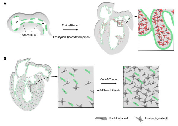 近20年来,关于成体心脏纤维化过程中肌成纤维细胞的来源一直存在争论,前期代表性研究发现成体心脏纤维化中内皮细胞会通过EndoMT转分化为间充质细胞(Zeisberg et al., Nature Medicine 2007),形成大量的肌成纤维细胞促进心脏纤维化,成为治疗心脏纤维化的一个重要靶点。该结论主要是基于Cre-loxP单同源重组酶的谱系示踪技术,存在时空分辨率较低,并可能有示踪假阳性的技术问题。此外,目前也没有技术能研究在成体心脏纤维化中内皮细胞是否会发生可逆的EndoMT,短暂或瞬时地表达间充质细胞的基因,由于缺乏研究手段并不清楚。