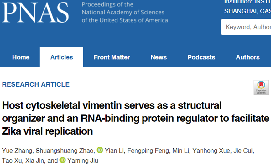 2月22日,中国科学院上海巴斯德研究所酒亚明课题组在国际期刊PNAS发表了题为“Host cytoskeletal vimentin serves as a structural organizer and an RNA-binding protein regulator to facilitate Zika viral replication”的文章,该研究利用多种显微成像技术和组学分析,首次阐述了中间丝波形蛋白vimentin在寨卡病毒感染中的物理空间支撑与生物功能调控的双重作用。