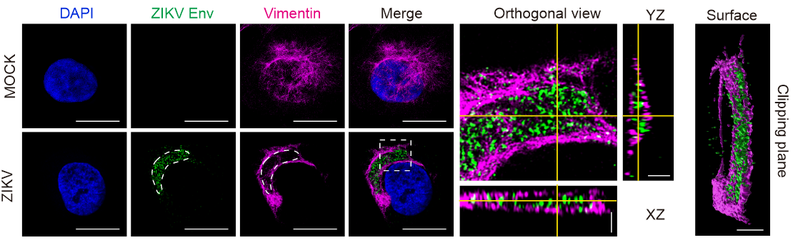 图1. Vimentin filaments围绕ZIKV病毒蛋白形成笼状结构