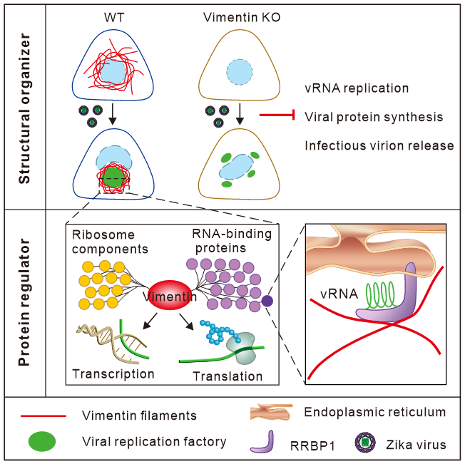 图2. Vimentin filaments在ZIKV病毒感染过程中作为‘结构支撑’和‘调节因子’的双重功能