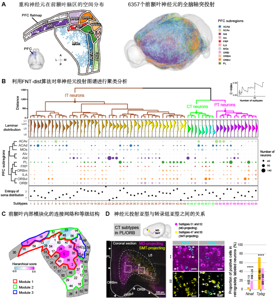 图注(A)6357个前额叶单神经元在前额叶亚区的分布和全脑轴突形态。(B)神经元形态学分类。64个前额叶投射神经元亚型在前额叶亚区和皮层深浅的分布。(C)前额叶内部连接网络的模块化和等级结构。(D)前额叶投射亚型与基因亚型的关系(CT皮层丘脑神经元在PL-ORB脑区)。