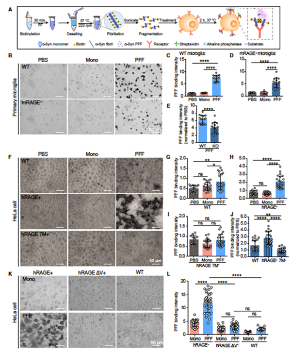 在本项工作中,研究人员利用一系列生物化学,生物物理学及细胞生物学的实验方法,探究了RAGE与α-syn病理性纤维相互作用的分子机制以及其在α-syn纤维引起细胞炎症反应中的作用。研究发现:1)RAGE的 V型结构域(vRAGE)利用其表面正电荷与在α-syn病理性纤维表面富集的富含负电荷的C端结合,并呈现出纳米级的结合力;2)α-Syn纤维可特异性的与小胶质细胞上的RAGE受体结合(图1);3)RAGE受体介导α-syn纤维对于小胶质细胞的激活,并进一步引发炎症反应;4)抑制RAGE受体活性可显著的减弱α-syn纤维引发的小胶质细胞炎症反应 。