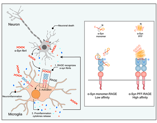 2022年9月20日,上海有机化学研究所交叉中心刘聪研究员团队与上海交通大学Bio-X研究院李丹教授团队合作在Cell Press细胞出版社期刊Cell Reports上发表了一篇题为 “Interaction of RAGE with α-synuclein fibrils mediates inflammatory response of microglia”的研究论文。该研究发现α-syn病理性纤维通过直接结合小胶质细胞表面的RAGE受体来诱导细胞炎症反应,揭示RAGE识别α-syn病理性纤维的分子机制。该工作为通过抑制神经炎症来治疗PD提供潜在的新靶点。