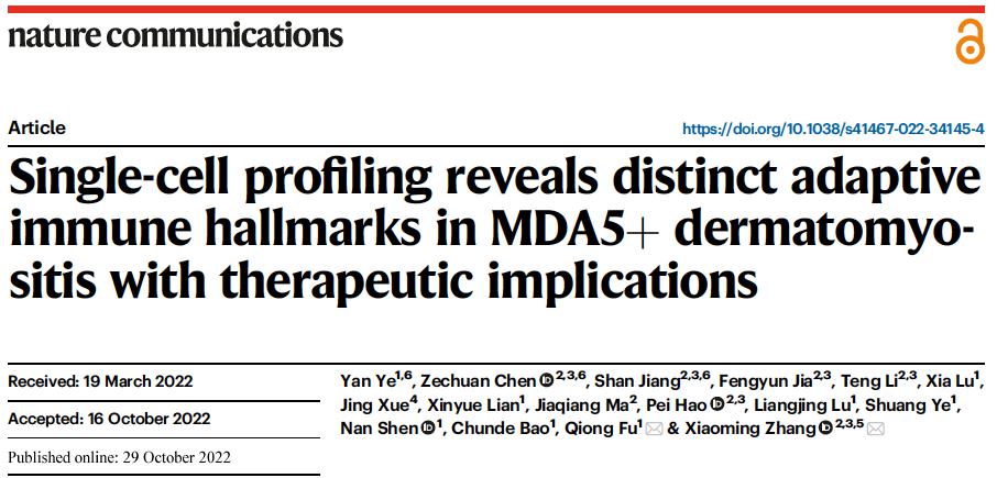10月29日,国际学术期刊Nature Communications在线发表了中国科学院上海巴斯德研究所张晓明课题组题为Single-cell profiling reveals distinct adaptive immune hallmarks in MDA5+ dermatomyositis with therapeutic implications的研究论文,揭示了高致死性“MDA5抗体阳性皮肌炎”(Anti-melanoma differentiation-associated gene 5-positive dermatomyositis,简称“MDA5+ DM”)的核心免疫学特征和靶向治疗新思路。