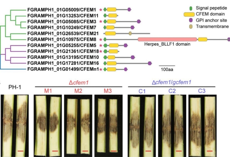 图1. 禾谷镰孢菌编码11个非Pth11类型CFEM蛋白,其中6个对侵染玉米的致病力有显著贡献