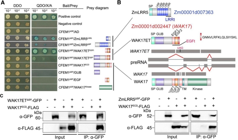 图2. 禾谷镰孢菌CFEM蛋白与玉米胞外蛋白ZmLRR5及ZmWAK17ET相结合,而ZmLRR5及ZmWAK17ET则与玉米细胞壁相关受体激酶ZmWAK17的胞外域相结合