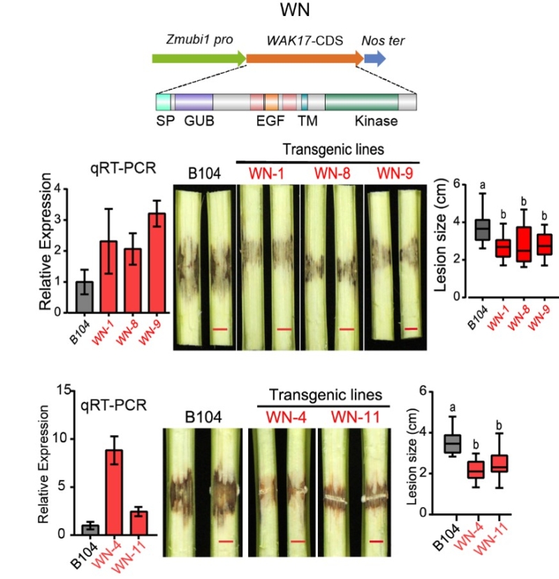 图3. 玉米细胞壁相关受体激酶ZmWAK17的表达量增加能够增加对赤霉茎腐病的抗病性