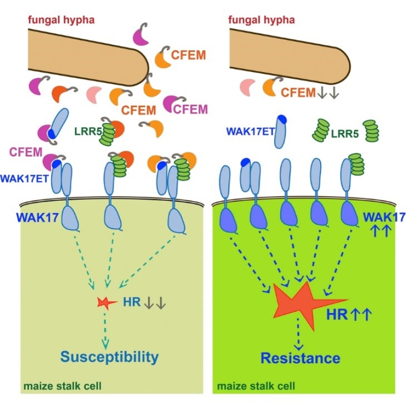 本研究发现禾谷镰孢菌分泌的多个CFEM蛋白对增强致病力有显著贡献,且在侵染玉米时定位于侵染菌丝的表面。利用其中一个CFEM1蛋白作为诱饵,从侵染玉米茎秆的酵母文库中筛选到两个互作蛋白ZmWAK17ET和 ZmLRR5。ZmLRR5是一个具有亮氨酸富集重复LRR的分泌蛋白,而ZmWAK17ET则是细胞壁相关受体激酶ZmWAK17的一个可变剪接产物。这两个蛋白不仅与真菌CFEM蛋白互作,也与受体激酶ZmWAK17的胞外域互作。遗传学分析发现,ZmWAK17突变体对于禾谷镰孢菌更感病,病斑面积增加可达40%;而过表达ZmWAK17的转基因玉米增强对禾谷镰孢菌的抗性,而病斑面积减小可达30%。本研究进一步提示ZmWAK17可引起烟草细胞超敏反应,而CFEM蛋白和ZmWAK17ET 或者ZmLRR5共表达可抑制ZmWAK17诱导的超敏反应。这些研究结果表明,禾谷镰孢菌通过分泌CFEM效应因子,利用寄主分泌蛋白ZmWAK17ET和 ZmLRR5对于介导抗病的受体激酶ZmWAK17进行负调控,从而达到成功侵染。