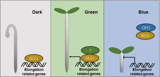商用绿色LED光源都会发出少量蓝光或红光。刘宏涛研究组结合滤光片制作出不含有红光或蓝光的纯绿光光源,发现与蓝光、红光、远红光或UV-B光抑制下胚轴伸长不同,绿光促进而不是抑制拟南芥和其他多种植物的下胚轴伸长。进一步的研究发现植物目前已知的光受体光敏素、隐花素、向光素等都不能作为绿光受体介导绿光促进下胚轴伸长,暗示有新的光受体存在并介导绿光信号转导。该研究发现内源激素油菜素甾醇信号通路参与绿光信号转导。BES1是油菜素甾醇信号转导中的关键转录因子,绿光能促进BES1的DNA结合活性,从而调控基因转录以促进下胚轴伸长。这些结果表明,绿光作为重要的环境信号促进下胚轴伸长。被其他植物遮挡的植物感受到的红光和蓝光大大减少,而绿光较多(上层叶片吸收较多红光和蓝光,而绿光较少),绿光可作为遮荫信号,促进伸长,使植物能够适应遮荫环境。