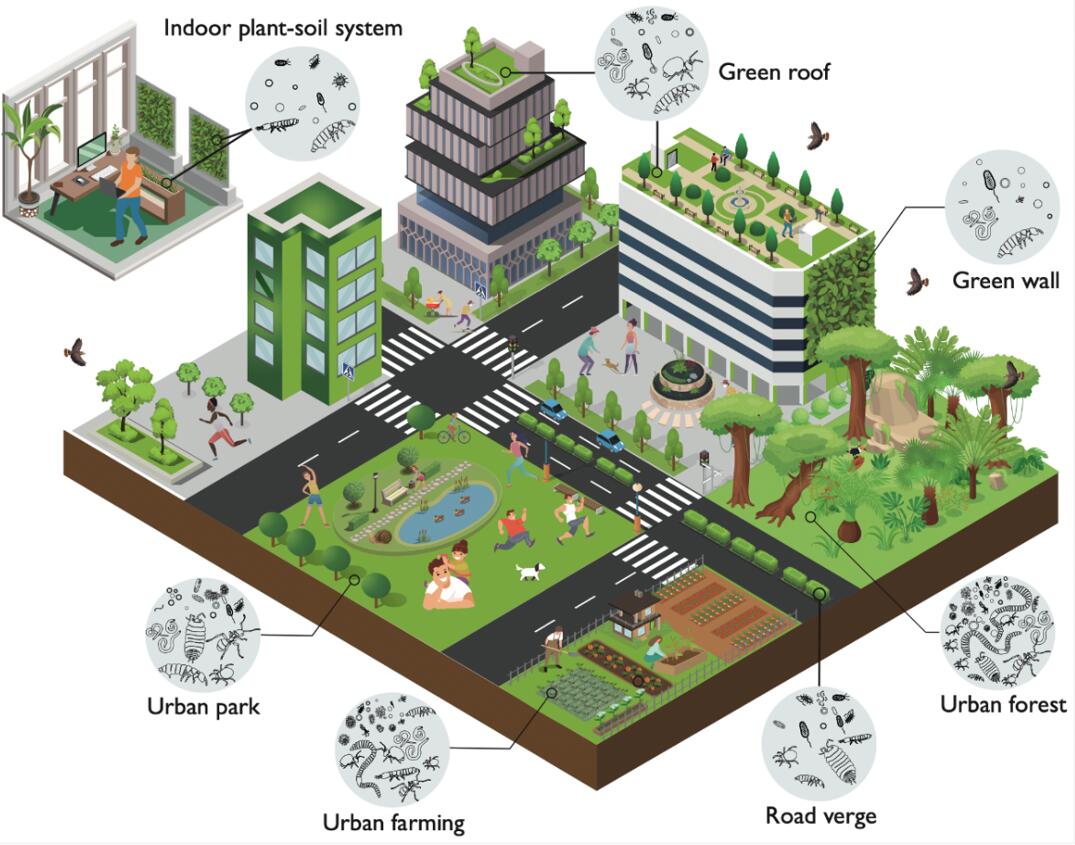 图1 土壤是城市生态系统中生物多样性的主要储存库。人类造成的干扰和自然栖息地的丧失大大影响了城市土壤的生物多样性。然而,有多种方案(如绿色屋顶和墙壁、室内栖息地、公园绿地修复等)可通过提供更多的土壤生物栖息地,以增加室内和室外空间的土壤生物多样性。
