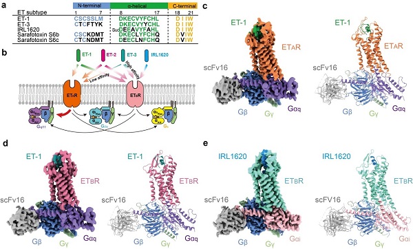 图1. 内皮素受体ETRs与多肽配体复合物的冷冻电镜结构。a. ETRs配体的序列比对示意图; b. ETRs对配体的选择性及下游G蛋白示意图; c-e.ET-1-ETAR-Gq, ET-1-ETBR-Gq, IRL1620-ETBR-Gi复合物冷冻电镜密度图及卡通示意图。