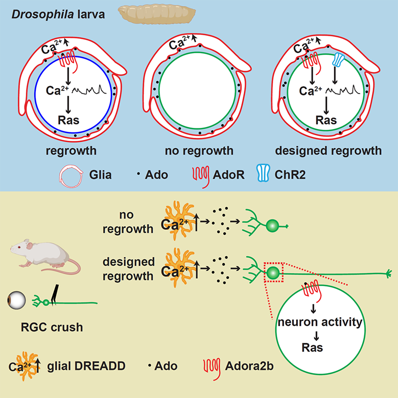 果蝇丰富的遗传学工具及其幼虫体壁四种外周感觉神经元为研究神经轴突再生提供了强大的系统(图一)。前期研究发现,包裹这些感觉神经轴突的胶质细胞是轴突再生必须的,但是胶质细胞促进神经轴突再生的机制仍不清楚。该研究发现,胶质-神经细胞递质传递决定了不同的轴突再生反应(图二上)。通过钙成像技术,发现神经元轴突损伤后,周围的胶质细胞会积极响应,产生Ca2+ 尖峰导致ATP/腺苷释放。由于C4da神经元特异表达腺苷受体(AdoR),可以引发下游由高频簇状放电-Ca2+尖峰-Ras组成的促再生通路。阻断其中任一组分会抑制C4da神经元的轴突再生。另一方面,由于C3da神经元缺乏腺苷受体表达,自身无法感受到来自胶质细胞的腺苷信号而启动促再生程序。在C3da 神经元中表达腺苷受体可以激活高频电发放-Ca2+ 尖峰-Ras信号通路而显著地促进轴突再生。此外,在C3da神经元中利用光控遗传学引入高频簇状放电诱导Ca2+尖峰或者遗传学方法激活Ras信号通路都可以促进轴突再生。同时,该研究发现是特异高频电发放,而不是整体的兴奋性提高诱导了轴突再生。因此,在果蝇幼虫感觉神经系统阐明了由神经胶质传递激活的特异轴突再生程序,激活该程序可以促使本无再生能力的神经轴突再生。