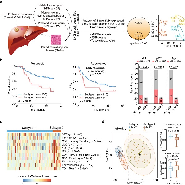 研究人员前期根据蛋白质组特征将肝细胞癌分成了三个亚型,即代谢驱动型、微环境失调型和增殖驱动型( Cell,2019),对三个亚型的配对癌旁组织进行蛋白质组分析发现其具备对应癌组织的分子分型特征,提示癌旁组织蛋白质组具有分子异质性(图a)。基于此,科研人员采用非监督聚类方法,根据蛋白质组数据将癌旁组织分为两个亚型S1型和S2型。其中S2型病人约占病人总数的15%,病人年龄偏大,ALT和γ-GT含量较高,预后较差且有较高的复发风险;S2型癌旁组织高表达的蛋白显著富集到ECM-受体相互作用通路、抗原处理和呈递、细胞粘附、PI3K-Akt信号通路等,而低表达的蛋白显著富集到各种代谢相关通路。上述癌旁组织分型标准在前期贺福初院士团队与樊嘉院士团队合作发表的高质量肝癌癌旁蛋白质组数据集( Nature,2019)中得到了验证(图b)。利用解卷积算法,研究团队在癌旁组织中预测了组织浸润免疫细胞组成,发现S2型癌旁组织中树突状细胞、CD8+T细胞、成纤维细胞等含量较高,并采用多重荧光免疫组化在癌旁组织芯片中进行了验证(图c)。进一步,团队采用DIA-MS技术,对正常肝组织、两个亚型的癌旁组织及其配对癌组织进行了定量蛋白质组学分析,聚类分析发现S1型癌旁与正常肝组织类似,而S2型癌旁与癌组织更为接近。相比于正常组织,在S1型癌旁组织中有112个上调蛋白和71个下调蛋白;其中13个上调蛋白为分泌蛋白,可作为潜在血液生物标志物用于肝癌的早期诊断;另一些差异蛋白,可能会参与肿瘤的免疫微环境重塑或促进肿瘤的复发(图d)。