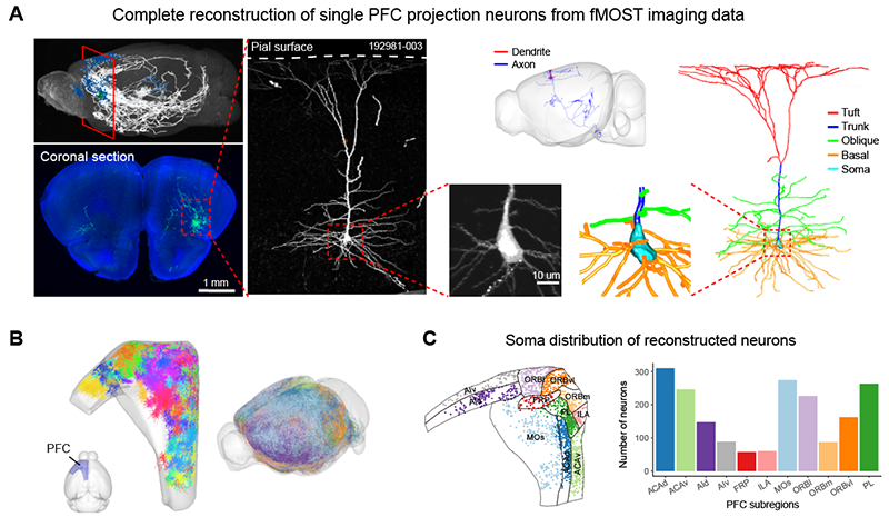 图1 神经元树突和轴突形态的完整重构。(A)fMOST原始图像和单神经元重构结果。(B)重构的前额叶皮层神经元(n=1920)的树突和轴突。(C)重构神经元胞体在前额叶皮层亚区的空间分布。