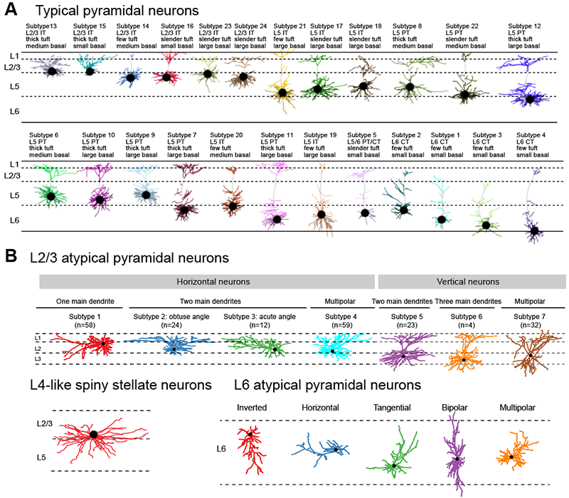 为了研究这一问题,严军研究组在此前工作的基础上重构了1920个神经元的树突形态(图1),其中包括1515个典型锥体神经元树突和405个非典型锥体神经元树突。通过精细定量刻画树突的形态和聚类分析,研究人员发现了24种类型的典型锥体神经元树突以及多种非典型锥体神经元树突(图2)。