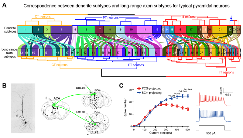 接着,研究人员进一步研究了神经元树突形态和轴突投射的关系,发现树突越复杂的神经元轴突投射也越广泛,并且由树突形态定义的神经元亚型与由轴突投射定义的神经元亚型之间有很强的对应关系,说明神经元在接收信号和传递信号的模式上具有一致性(图3A)。在前额叶皮层PL-ACA区域存在两类轴突投射不同的PT神经元(SCm投射和PCG投射),而它们的树突形态也存在显著差异。同时,通过逆行标记和膜片钳记录,研究人员发现这两类神经元在电生理性质上也存在着显著差异(图3B),说明树突形态和轴突投射的变化伴随着神经元在功能上的变化。
