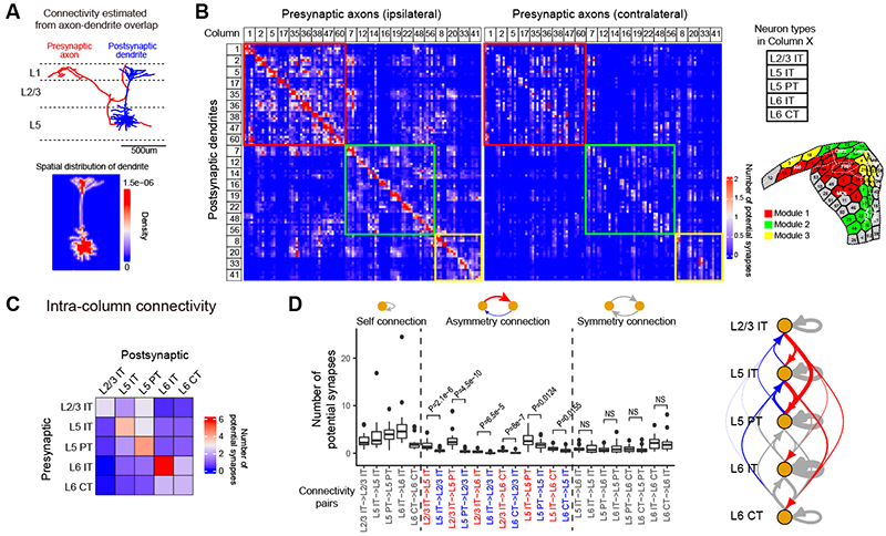 图4 基于树突和轴突形态构建和分析前额叶皮层联接网络。(A)计算两个神经元之间潜在联接的示意图。(B)前额叶皮层不同类型神经元之间的联接网络。(C)同一个“皮层柱”内不同类型神经元的联接模式。(D)神经元类型之间联接对称性的分析和结果示意图。