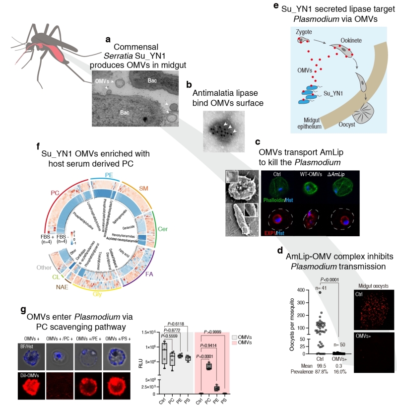 (a) 肠道共生菌解脲沙雷氏菌在吸血按蚊肠道内产生大量的外膜囊泡OMVs;(b) 抗疟脂肪酶AmLip分泌后与OMV结合形成AmLip-OMVs复合物;(c) OMVs跨界转运AmLip进入并快速裂解疟原虫;(d) AmLip-OMVs复合物显著抑制按蚊中肠内疟原虫的发育和感染;(e) Su_YN1通过OMVs递送AmLip阻断疟原虫经按蚊传播的示意图;(f) 宿主血清诱导Su_YN1产生的OMVs富含大量PC等宿主血清来源的脂质成分;(g) 富含PC等脂质的OMVs通过疟原虫PC清除途径被摄取进入疟原虫,实现跨界递送抗疟效应蛋白AmLip靶向杀灭疟原虫。
