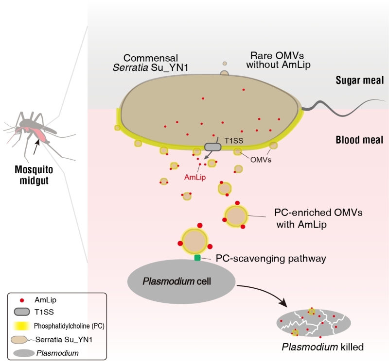 2023年8月24日,中国科学院分子植物科学卓越创新中心王四宝团队在国际学术期刊Nature Communications上在线发表了题为"Outer membrane vesicles from a mosquito commensal mediate targeted killing of Plasmodium parasites via the phosphatidylcholine scavenging pathway"的研究论文。该研究首次报道了蚊虫肠道共生细菌通过释放的胞外囊泡,利用疟原虫磷脂酰胆碱清除途径,跨界递送抗疟效应分子,实现靶向杀灭疟原虫的全新机制。