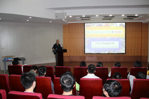 本次活动由重点实验室主任吴家睿研究员主持,他用当前的社会热点——细胞治疗开场,引出实验室副主任胡荣贵研究员题为“生物的复杂性和肿瘤”的主题报告。报告从生命、细胞的构成讲起,一步步阐释生物复杂形状的意义,深入浅出、图文并茂,在向听众介绍目前肿瘤治疗相关的方法手段的同时,也与大家一起探讨了未来肿瘤治疗可能的趋势及新技术新方法的发展。报告结束后,听众纷纷提问,与胡荣贵、吴家睿进行了热烈的交流。
