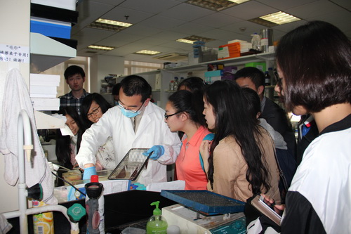 随后,学生们参观了化学生物学技术平台及相关研究组。化学生物学技术平台的岳丽云博士为学生介绍了平台的高通量仪器,并演示了液体工作站的操作方法。季红斌、王红艳、杨巍维研究组的工作人员带领大家先后观摩了RNA提取、细胞切片制备等实验。参观过程中,学生与实验室人员进行了良好的互动,并饶有兴趣地进行了动手操作。