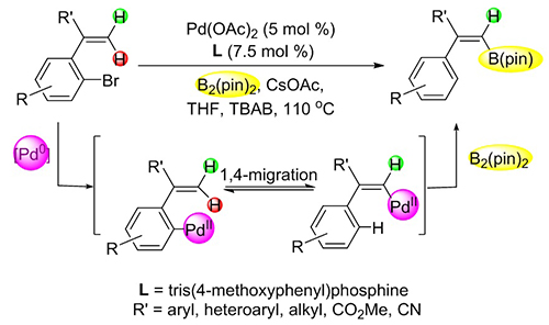 芳基向烯基位置的1,4-钯迁移/硼化反应