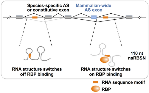 高等真核生物中的可变剪接可以从一个前体mRNA分子产生多个成熟的mRNA分子,极大地拓展了基因功能的多样性。已有的研究表明,可变剪接受到具有特殊碱基短序列的顺式调控元件(RNA motif)和识别这些motif的RNA结合蛋白(RNA binding protein, RBP)调控。因此,发现和鉴定具有特殊序列的RNA motif及其相应RBP可以预测受调控的可变剪接。但是,一些最新的生化结合高通量测序分析研究表明,体内大概只有很少的一部分RNA motif(约15-40%)能够与其相应的RBP结合。这提示,除了motif自身的特殊碱基序列以外,还有一些其它的序列/结构特征能够影响RNA motif与相应RBP的结合。在最新一期Molecular Cell上,来自于美国MIT的Christopher B. Burge教授实验室利用多种生化技术,结合计算和进化生物学方法对这一问题进行了系统分析,系统揭示了除了具有特殊碱基序列的RNA motif以外,区域性的RNA二级结构对RBP与RNA motif的结合具有决定性的作用。一方面来讲,当RNA motif序列位于RNA二级结构的单链开放区间时,其与RBP的结合能力较强,可以显著地调控可变剪接的发生;而从另一方面来讲,当RNA motif序列位于RNA二级结构的双链闭合区间时,其与RBP的结合被抑制,因此不能够调控可变剪接的发生。这一最新的研究成果提示区域性RNA二级结构可以作为调控RBP结合RNA motif的重要开关,为进一步建立更精确的RNA可变剪接预测模型提供了全新的研究基础。