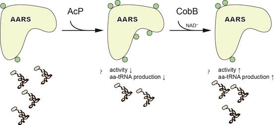 蛋白质组学分析表明,来自大肠杆菌(Escherichia coli)到人类(Homo sapiens)的aaRS都具有乙酰化修饰,且一些被鉴定到具有乙酰化修饰的赖氨酸残基是保守的。在王恩多研究员的指导下,博士研究生叶青等人研究了大肠杆菌中aaRS的乙酰化修饰对酶活力带来的影响。他们通过质谱鉴定获得了大肠杆菌体内LeuRS (EcLeuRS)和ArgRS (EcArgRS)乙酰化修饰的位点信息;利用谷氨酰胺(glutamine,Glu)扫描(Glu scanning,模拟具有乙酰化修饰的Lys)发现EcLeuRS上的3个位点(Lys619、Lys624和Lys809)和EcArgRS上的2个位点(Lys126和Lys408)对酶的催化活力具有重要作用;使用pAcKRS系统,获得了定点插入ε-氨基乙酰化的赖氨酸(Nε-acetyl-L-lysine,Ac-Lys)的EcLeuRS和EcArgRS。他们在分析以上乙酰化修饰的酶的性质后,发现以上Lys残基的乙酰化修饰的酶降低了氨基酸的活化活力和酶与对应tRNA之间的亲和力,使酶的氨基酰化活力降低或丧失。此外,他们通过体外实验发现,一种被报道可以在原核细胞中化学修饰乙酰化蛋白质的高能化合物乙酰磷酸(acetyl-phosphate,AcP)和沉默信息调节因子2相关酶(silent information regulator 2-related enzymes,Sirtuin)家族的去乙酰化酶CobB可能参与乙酰化和去乙酰化修饰EcLeuRS和EcArgRS的调节中。以上研究结果揭示了乙酰化修饰对aaRS氨基酰化活力潜在的调节功能,首次提出乙酰化修饰可能作为一种翻译后水平的开关控制aaRS的活力,从而影响蛋白质翻译过程。