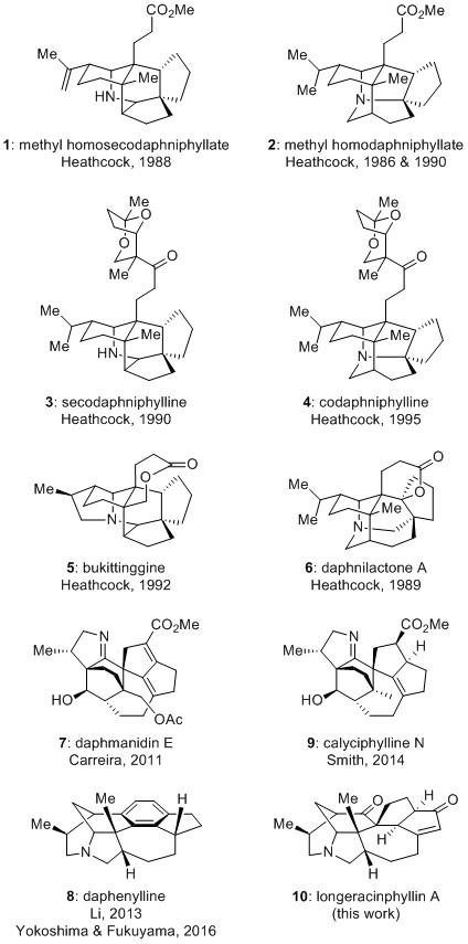 虎皮楠生物碱 (Daphniphyllum alkaloids) 具有抗肿瘤、抗病毒和调控神经生长因子等多种生物活性,在过去三十年中受到了合成化学家的密切关注。该家族超过300个成员中仅有9个分别被Heathcock、Carreira、Smith、Fukuyama和李昂课题组成功合成。Longeracinphyllin A是由中科院昆明植物所郝小江课题组从Daphniphyllum longeracemosum中分离得到的,是虎皮楠生物碱中成员较多的calyciphylline A小家族的代表性分子之一。它具有6−6−5−7−5−5的六环核心结构以及多个连续的手性中心,具有较大合成挑战性。