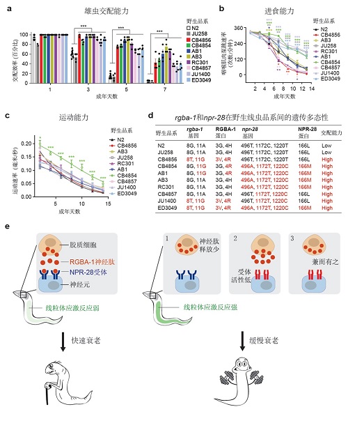 蔡时青研究组利用秀丽线虫这一模式生物探讨个体之间衰老速度差异的遗传机制。秀丽隐杆线虫是一种可以独立生活的微小动物(成虫体长仅1毫米), 其遗传背景清楚、生活史短、行为清晰,是目前研究衰老的重要模式生物,许多重要的调控衰老的信号通路是在线虫中首先发现的。他们发现来自世界不同地区的野生线虫在雄性交配、进食和运动能力方面随衰老退化速度存在着显著差异。通过进一步研究,他们发现一个全新的神经肽(RGBA-1)及其受体(NPR-28)编码基因上存在单核苷酸多态性(SNP),这些遗传多态性导致了野生型线虫雄性交配等行为能力退化速度不同。