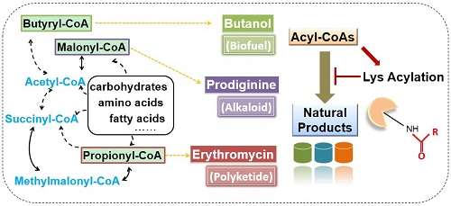 细胞重要中间代谢产物酰基-CoA类化合物,作为供体直接参与生物体内的蛋白酰化修饰,从而调控多种重要生物学过程,如表观遗传、能量代谢、精子发育等,是目前生命科学研究的热点之一。在生物体次级代谢产物生物合成过程中,酰基-CoA扮演的角色一直被认为是聚酮类、生物碱类、脂肪酸类及异戊二烯类等多种重要天然产物的合成前体,然而目前人们对其作为酰化修饰供体调控次级代谢产物合成过程的作用认知明显不足。