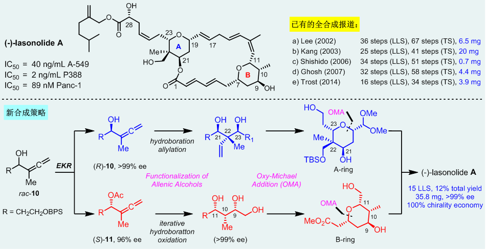 中国科学院上海有机化学研究所天然产物有机合成化学院重点实验室的洪然课题组近期完成了lasonolide A的对映选择性全合成(Angew. Chem. Int. Ed. 2018, 57, 16200–16204; doi: 10.1002/anie.201811093)(图示)。他们在研究中巧妙地把硼氢化/氧化和酶催化的动力学拆分结合起来,提供了全新的合成策略。动力学拆分是经典的手性化合物的制备方法,其特点在于通过拆分可同时获得R与S构型产物,但合成中往往只利用其中的一个对映异构体,另一个对映体的回收利用免不了额外的化学转化。该课题组设计一系列的立体选择性的硼氢化/氧化的方法,将拆分所得的R与S构型产物通过平行的路线分别合成目标分子中不同的手性结构片段,然后在全合成的后期重新汇聚到目标分子中。该合成策略可以完美地将动力学拆分的手性利用率达到100 %。其中运用的酶拆分 (EKR) 和构建多手性中心的四氢吡喃环的方法均是该团队先前所发展的合成方法(Tetrahedron Lett. 2016, 57, 603–606; Angew. Chem., Int. Ed. 2016, 55, 6280–6284),而且研究中利用烷基硼烷作为醇和酸的保护基也是独特新颖的设计。该工作以最长线性15步的化学反应和12 %的总收率合成了35.8 毫克的lasonolide A,为后续化合物的积累和类似物的合成奠定了方法学的基础。