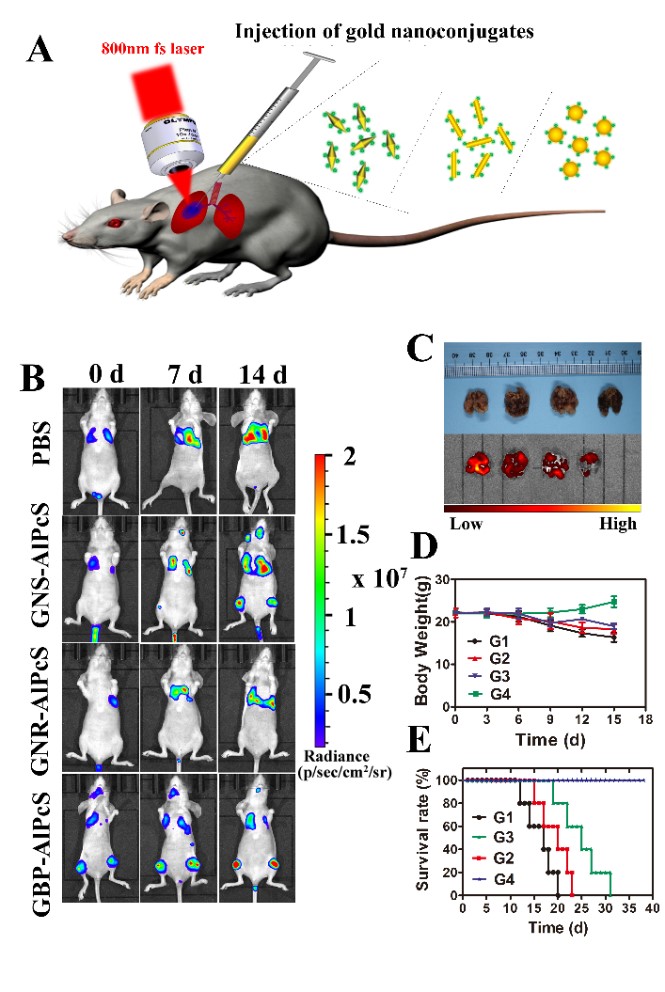 (A)小鼠原位肺癌杀伤示意图;(B)小鼠原位肺癌细胞杀伤活体荧光像;(C)杀伤后肺部剥离实物图以及荧光图;(D)治疗过程中小鼠体重变化;(E)经过不同药物的治疗后,小鼠的存活情况。