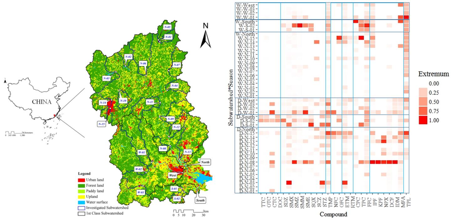 全球水环境中普遍检出药物残留,已引起广泛关注。已有研究推测水体药物残留与流域内土地利用特征及各种人类活动相关。鉴于此,城市环境研究所城市与健康重点实验室流域(湿地)生态与环境研究组(俞慎课题组)以我国福建省九龙江流域为研究对象,基于子流域城镇用地比例构建城镇化梯度,于2014年枯水期和2015年丰水期分别在子流域汇流点地表水中检出3大类27种人兽药物残留,包括20种抗生素、6种非甾体消炎药和1种呼吸系统药物;检出人兽药物残留以抗生素为主;残留水平在未检出至ng L-1,但土霉素、四环素、多西环素、磺胺嘧啶、磺胺间甲氧嘧啶和脱水红霉素等人兽药物残留浓度高达μg L-1;地表水人兽药物检出种类和频率及残留水平均具显著季节性和城镇化梯度;城镇化是影响流域水体人兽药物残留的最大贡献因子;此外,降水不单具稀释效应且与流行疾病相关的药物残留有关。