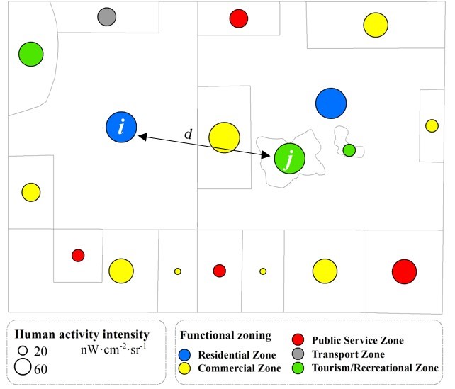 图1 抽象为点的街区,每个街区包含功能属性和人为活动强度两个属性