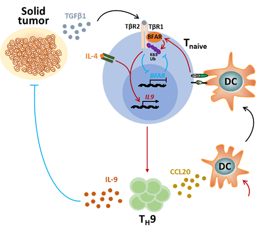 BFAR靶向TGFβ信号通路调控TH9的分化及其介导的抗肿瘤免疫反应机制示意图