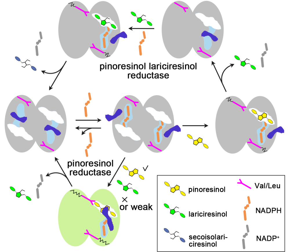 研究团队选取了三个序列高度相似(Identity>80%)但具有底物选择性差异的PLR(菘蓝IiPLR1能高效催化Pin生成Lar并进一步生成Sec,而拟南芥AtPrR1催化Pin生成Lar的效率显著强于催化Lar生成Sec的效率;AtPrR2仅能催化Pin生成Lar)。研究通过解析IiPLR1/AtPrR1/AtPrR2处于反应过程不同状态的晶体结构,发现PLR/PrR蛋白均以首尾相连的二聚体形式存在,底物结合和催化由两个单体共同完成;β4 loop(蓝色哑铃图形)起到门控开关的作用,其摆动可以控制辅酶NADPH的进出(图1)。