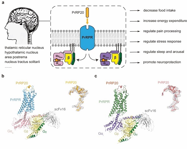 图1 (a)PrRP20介导的PrRPR的G蛋白信号传导通路及其生理作用示意图。(b)PrRP20-PrRPR-Gq-scFv16和 PrRP20-PrRPR-Gi-scFv16复合物的冷冻电镜结构。