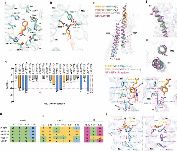 图2(a,b)RF-酰胺基序与受体的相互作用口袋。(c)功能实验数据验证配体结合口袋关键氨基酸对PrRPR激活的影响。(d)RF-酰胺肽受体的配体结合口袋残基保守性比较。(e-g)PrRP20-PrRPR复合物结构中的激活态构象变化。(h,i)Y1463.37残基所介导的“Toggle Switch”摆动。