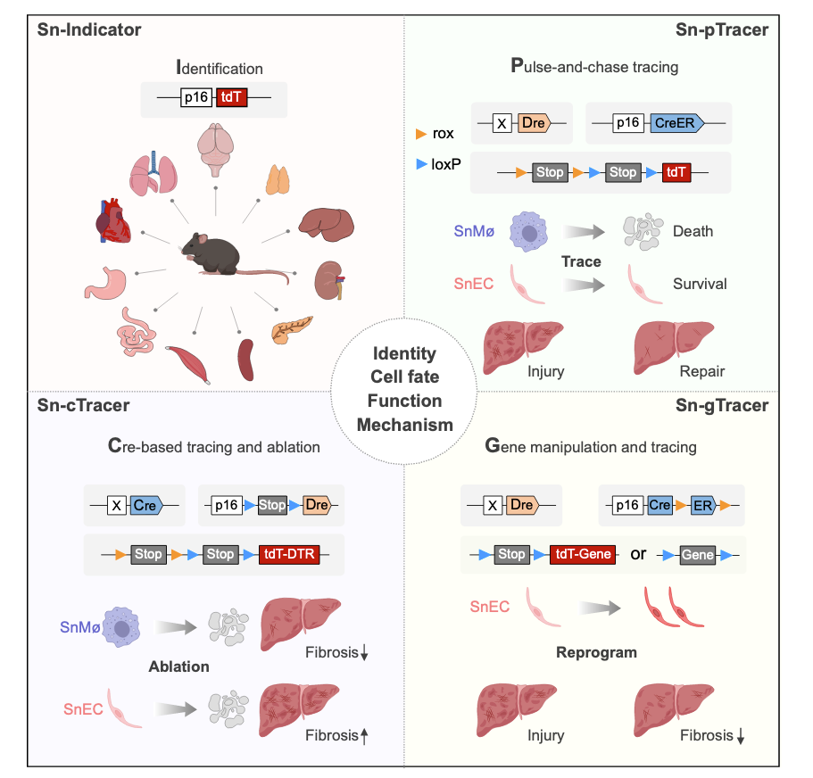 细胞衰老这一概念最初由Leonard Hayflick及其同事于1961年提出,其在胚胎发育、癌症、衰老和其他多种疾病等生理病理过程中发挥着重要作用。细胞衰老具有多种特征,包括细胞周期阻滞、细胞周期蛋白依赖性激酶(CDK)抑制蛋白(如 p16Ink4a、p21CIP1)的表达、衰老相关-β-半乳糖苷酶(SA-β-Gal)活性升高,以及衰老相关分泌表型(SASP,包括一系列趋化因子、白细胞介素、生长因子或组织重塑蛋白酶等)的显现。精准靶向体内的衰老细胞对于揭示其在衰老和各种病理状况中的机理作用至关重要。目前,p16Ink4a是研究细胞衰老广泛使用的标志物之一,它在抑制CDK4/6活性和限制细胞周期从G1期向S期转变过程中发挥着关键作用。众多研究利用p16Ink4a的表达来识别体内的衰老细胞,并构建了多种基于p16Ink4a的遗传小鼠模型。研究发现,在年轻和健康组织中基本上检测不到p16Ink4a的表达,但在衰老或损伤组织中会积累p16Ink4a+细胞,通过遗传或药物方法消除p16Ink4a+细胞,可以延长早衰小鼠的寿命,减轻生理衰老小鼠的年龄相关表型,并改善多种疾病,如动脉粥样硬化、肺纤维化、糖尿病、肝脂肪变性以及肿瘤发生等。然而,也有研究表明,衰老细胞在某些情况下可能发挥积极作用,如肿瘤抑制、胚胎发育、伤口愈合、毛发生长、促进肺再生等。然而,目前的衰老细胞功能研究都是非特异性地针对所有衰老细胞,而不考虑细胞类型,这使得特定细胞类型衰老细胞的命运轨迹和生理病理作用尚不清楚。为了解决这一科学问题,周斌组建立体内细胞衰老的谱系示踪及功能研究技术,揭示体内细胞衰老的命运轨迹和特定功能。