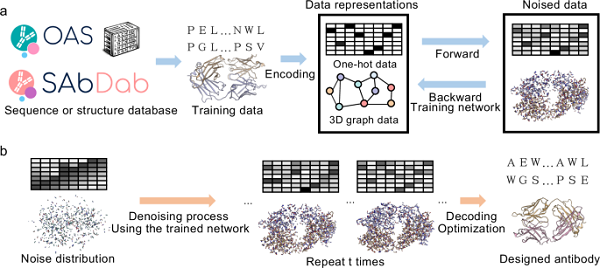 抗体是不可或缺的免疫系统组成部分,也是现代大分子药物设计最重要的部分,然而抗体药物的研发和优化通常面临花费多、周期长、优化难等实验相关的问题,亟待先进的计算方法提供支持和辅助。快速发展的人工智能(AI)模型已经在多种任务中起到了关键作用,而扩散模型作为AI领域的后起之秀,不仅对图片和视频生成产生了革命性改变,也已经在蛋白质设计、小分子设计等药物设计领域发挥了作用。鉴于扩散模型能够高效学习大量高质量数据的分布,并且能够根据提示词生成相关数据的特点,其在抗体设计领域中,尤其是用抗原作为“提示词”生成抗体方面,具有天然的优势。为此,本文综述了扩散模型在抗体设计领域的应用,以辅助架起抗体设计方面计算和实验的桥梁。