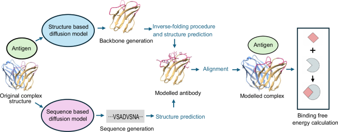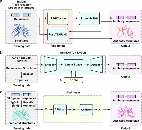 而针对已有抗体的优化问题,研究者们不仅可以使用针对抗体专门设计和训练的,基于结构或基于序列的模型(如DiffAb或NOS)来从抗原-抗体复合物结构出发生成新的抗原结合区,还可以使用通用的蛋白质设计模型(如基于结构的RFdiffusion、Chroma或者基于序列的EvoDiff、Taxdiff),这样的模型将生成新的结构或序列,后续可以在计算或实验方法上进一步评价所生成的蛋白质。该综述还讨论了如何在结构、序列、结合亲和力估计和实验方法上评测所生成的抗体。
