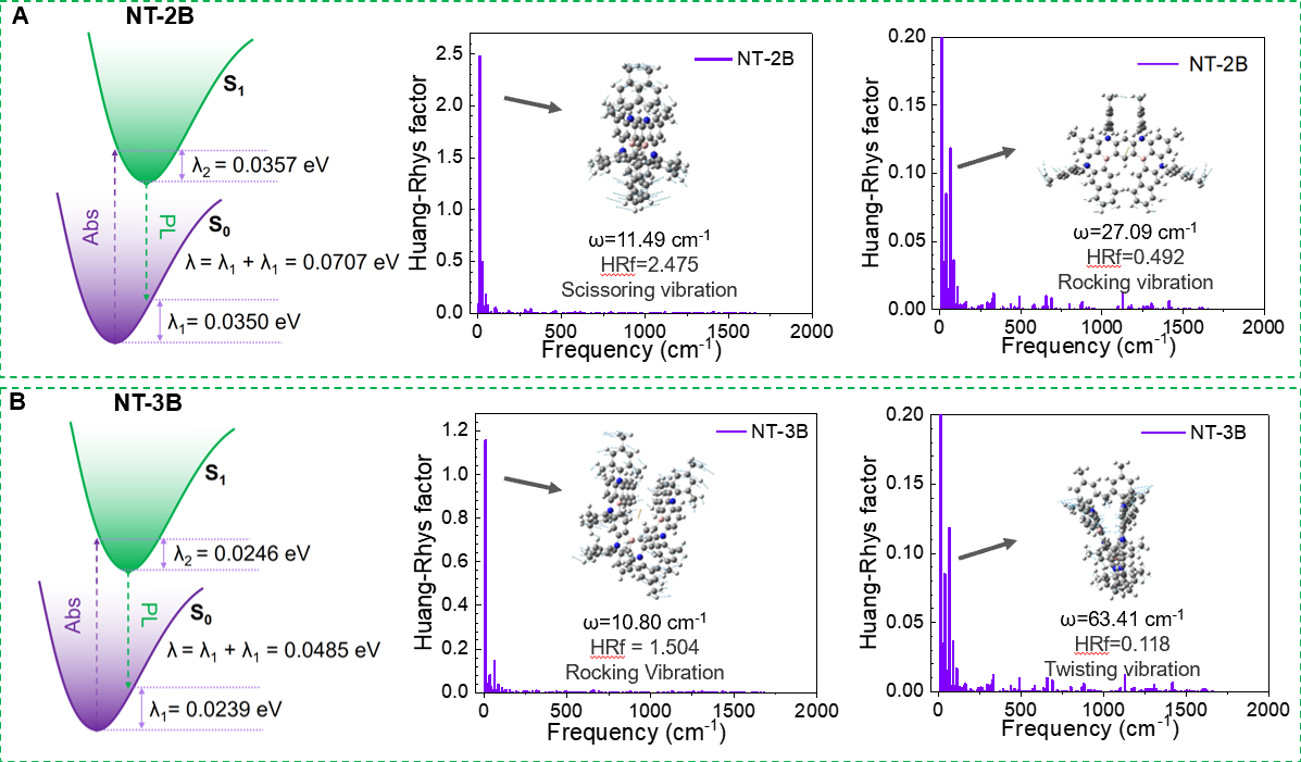 图2 (A)NT-2B和(B)NT-3B的S1→S0跃迁的重组能(λ)和黄-里斯(HR)因子