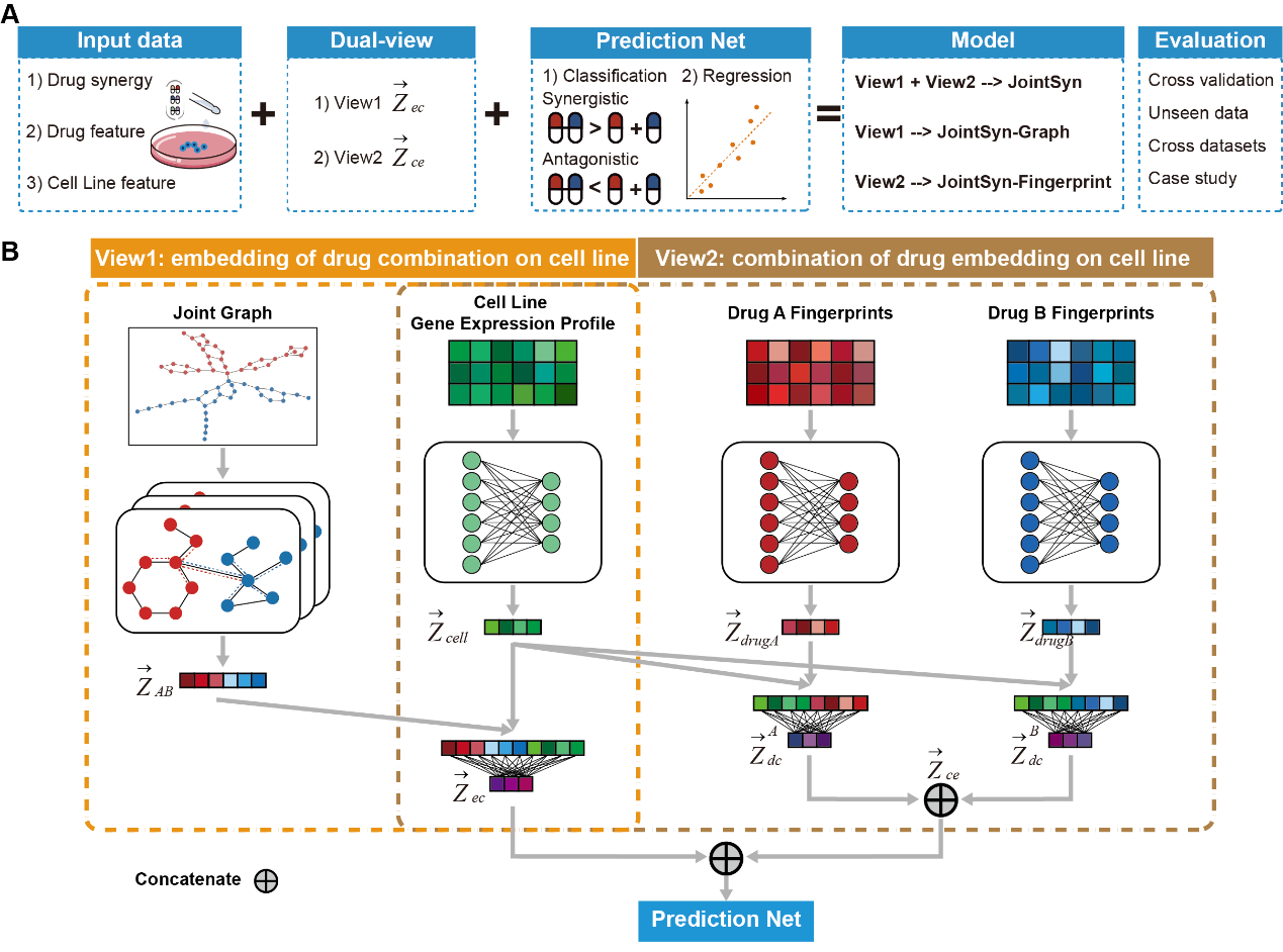 图1:双视图联合学习JointSyn提高药物组合协同性能预测