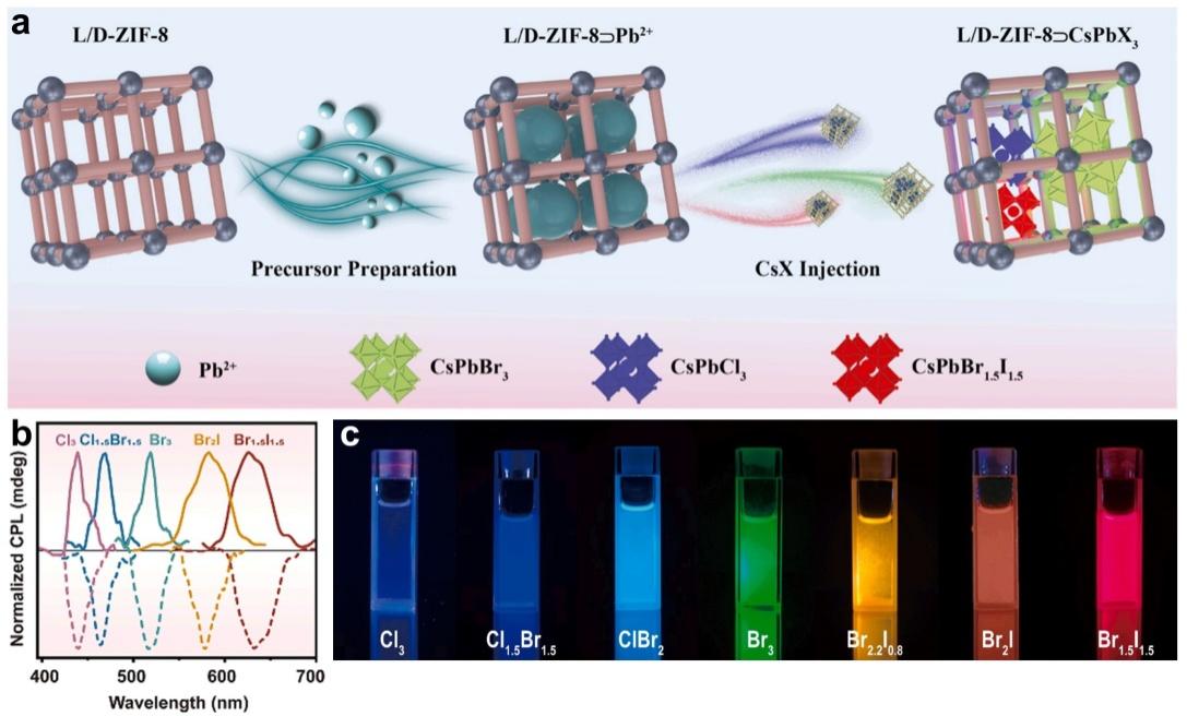 图1 全彩固态圆偏振发光材料L/D-ZIF-8⸧CsPbX3的(a)制备流程示意图;(b)圆偏振光谱图(X3 = Cl3,Cl1.5Br1.5,Br3,Br2I,Br1.5I1.5);(c)365 nm紫外灯下多色发光溶液照片(X3 = Cl3,Cl1.5Br1.5,ClBr2,Br3,Br2.2I0.8,Br2I,Br1.5I1.5)
