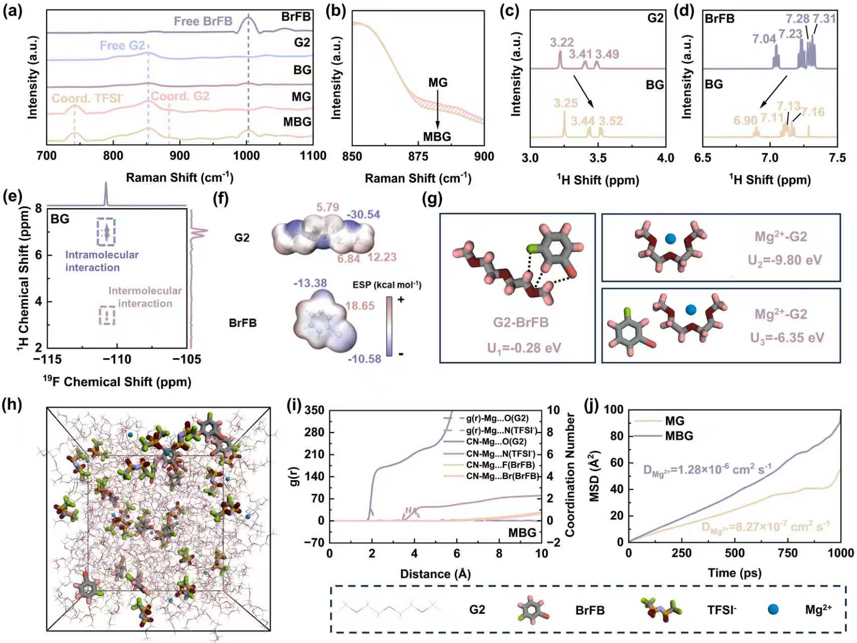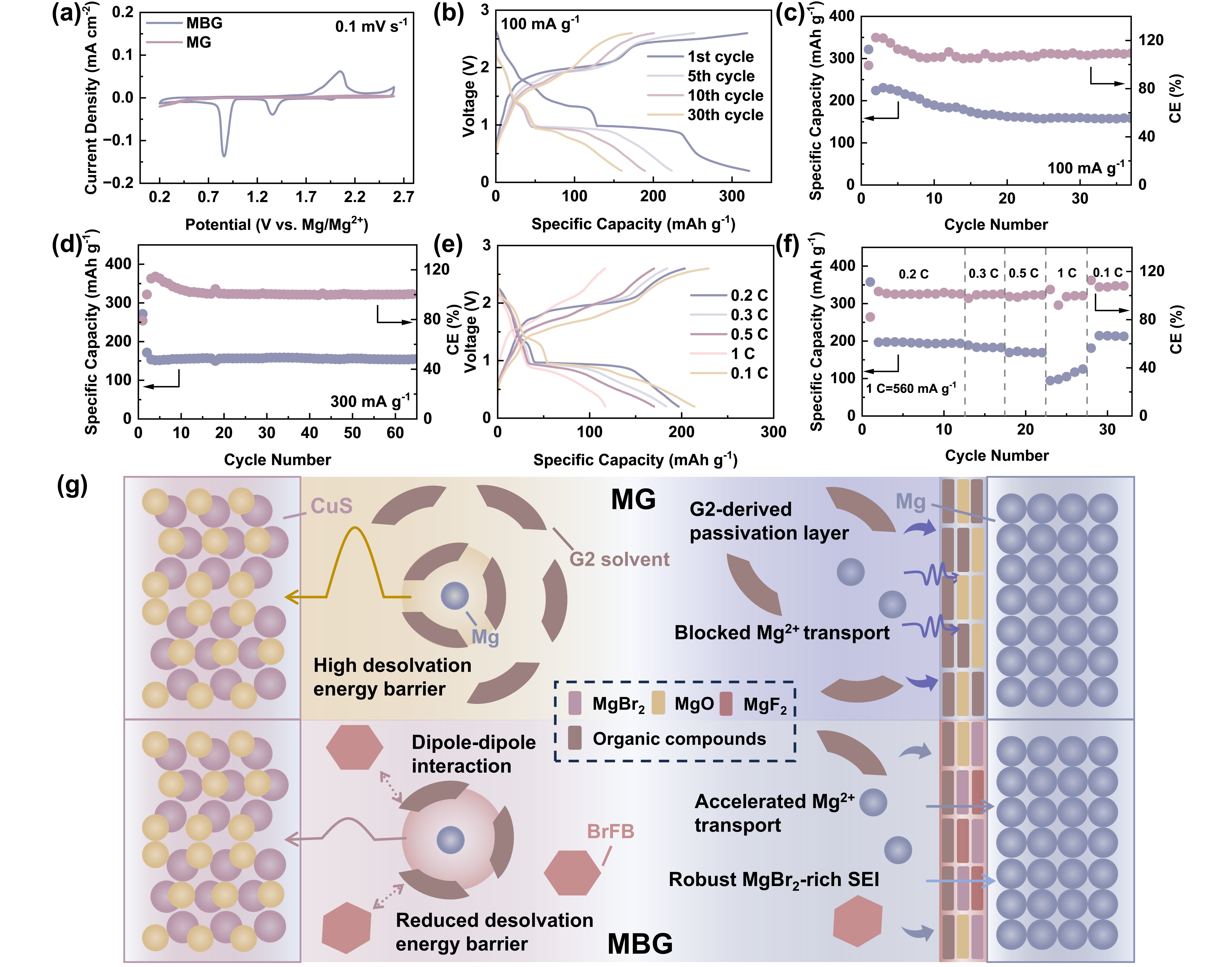 近日,中国科学院上海硅酸盐研究所李驰麟研究员团队通过引入间溴氟苯(BrFB)电解液添加剂,建立了“晶面取向调控-界面工程-溶剂化结构优化”的多级协同机制。在镁沉积行为调控方面,BrFB凭借其溴/氟官能团对Mg(002)晶面的特异性吸附,有效阻断了镁原子的水平堆叠生长,诱导形成了垂直取向的(110)晶面主导的均匀沉积,实现了超高面容量下的致密阵列结构镁负极。在界面化学层面,BrFB在电化学循环中原位分解形成Br/F杂化SEI,其中MgBr2组分构建低迁移能垒(0.27 eV)的离子传输通道,而MgF2纳米域提供电子绝缘屏障和机械支撑,协同抑制负极枝晶生长与界面副反应。在溶剂化结构调控中,BrFB与二乙二醇二甲醚(G2)溶剂通过C-F/C-Br…H-C偶极相互作用重构外层溶剂鞘,显著削弱Mg2+-溶剂配位强度,降低脱溶剂化活化能。该协同机制使镁对称电池在30 mAh cm-2超高面容量下稳定循环280小时(镁利用率89%)及-20℃低温下稳定运行600 小时;过电位显著降至190 mV,并可实现7000小时的超长稳定循环,突破了已报道添加剂策略的寿命极限。匹配CuS正极的全电池在300 mA g-1下保持了155 mAh g-1可逆容量,证实了该策略对高能量密度镁电池实用化的推进价值。相关成果发表于Energy Environ. Sci. 18,7254-7266,2025。