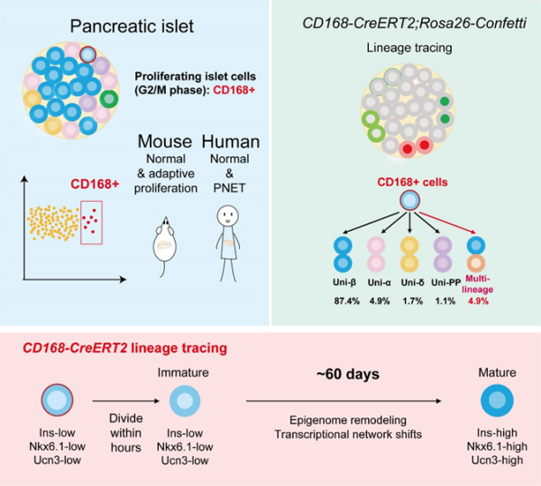 研究发现了CD168为增殖胰岛细胞的表面标志分子,并建立了相关的示踪小鼠模型,为理解胰岛细胞增殖与β细胞成熟机制提供了新的知识和工具,并为针对胰岛细胞增殖机制开发有效的糖尿病再生疗法奠定了理论基础。