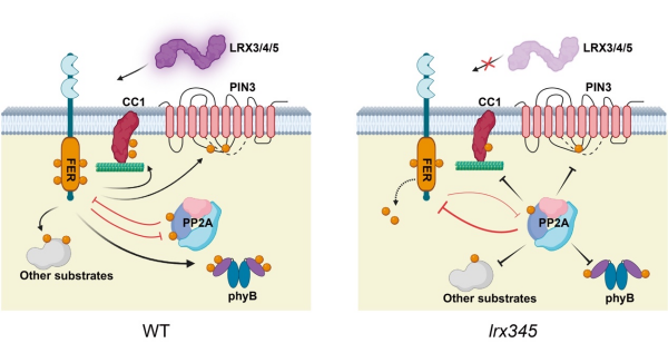 研究显示,细胞壁糖蛋白LRX3/4/5缺失,导致FER磷酸化水平及其激酶活性下降。研究进一步通过免疫共沉淀结合质谱技术发现,FER与磷酸酶PP2A复合体多个亚基存在相互作用。PP2A复合体能够去除体外FER激酶结构域的磷酸化修饰并抑制其激酶活性,而PP2A磷酸酶抑制剂斑螯素处理或者PP2A亚基突变,能够提升体内FER的磷酸化水平。这表明,PP2A磷酸酶介导FER的去磷酸化,抑制其激酶活性;斑螯素处理可回补lrx345突变体中降低的FER磷酸化水平及激酶活性,并恢复其耐盐性,表明该突变体对盐胁迫敏感的表型主要由FER激酶活性下降所致。