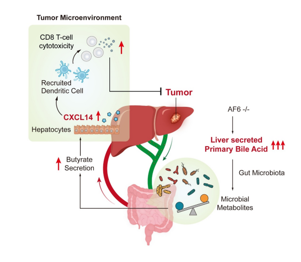 研究显示,初级胆汁酸/丁酸/CXCL14形成代谢—免疫作用轴,来改善肿瘤抑制性免疫微环境,从而抑制肝癌进展。研究发现了极性蛋白AF6是肝上皮细胞胆汁酸合成酶的核心调控子,并明确了AF6通过调控胆汁酸代谢稳态改善肝脏抑制性免疫微环境的作用机制。这为未来肝癌患者的临床治疗提供了新的治疗手段。